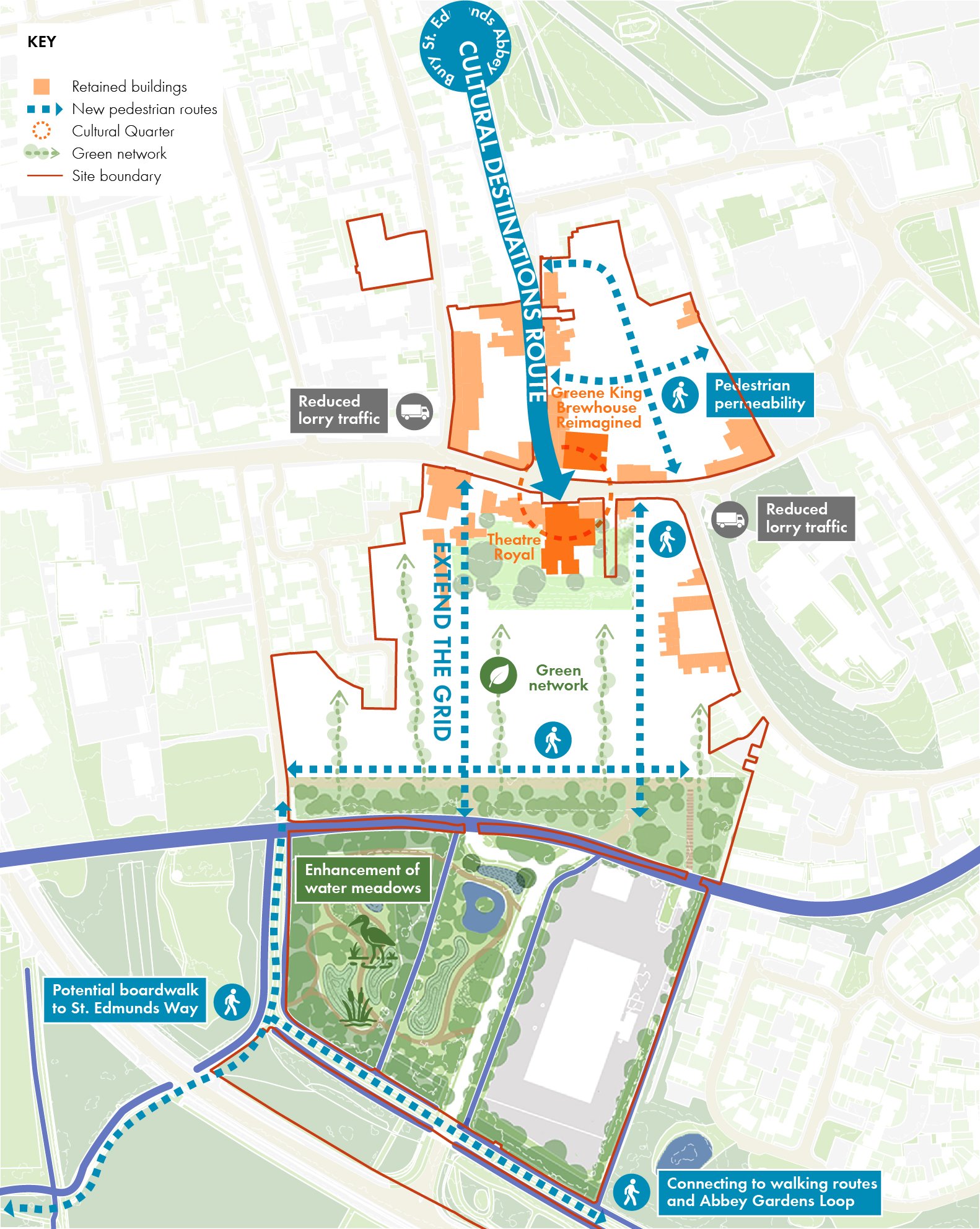 There is an opportunity to shape a series of new places, with distinctive characters and sense of identities. To the north of Westgate Street, the historic brewery sites could evolve into a distinctive urban quarter, where old and new buildings are seamlessly integrated to reflect and celebrate the area’s industrial heritage.